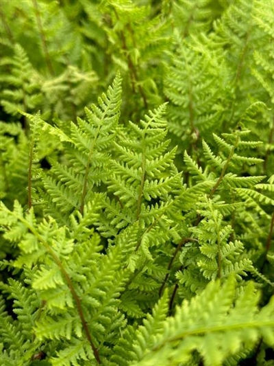 Athyrium filix-femina 'Lady In Red' is a striking fern variety known for its vibrant red stems and delicate, lacy fronds, making it an excellent choice for adding colour and texture to shaded garden areas.