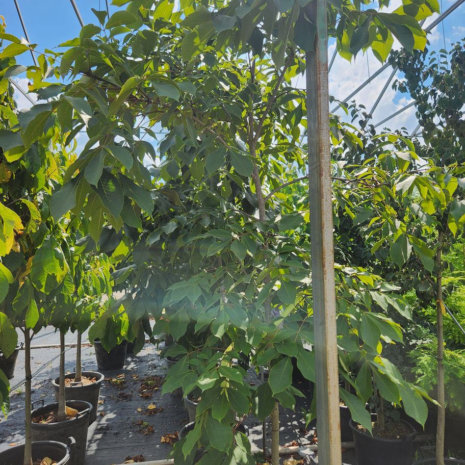 Shagbark Hickory when mature has increible peeling bark and very formal upright growth with leaves having a tropical feel to them, the canopy gets very full of small edible nuts as well.