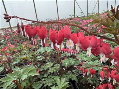 Discover the enchanting appeal of Dicentra spectabilis 'Valentine,' also known as Bleeding Heart, at Kampen Tree Supply. This exquisite perennial boasts heart-shaped, deep red blooms that gracefully arch along delicate stems, providing a striking contrast against its lush, green foliage. Perfect for shaded garden areas, its elegant blossoms draw not only admiring glances but also pollinators, enhancing your garden's biodiversity.